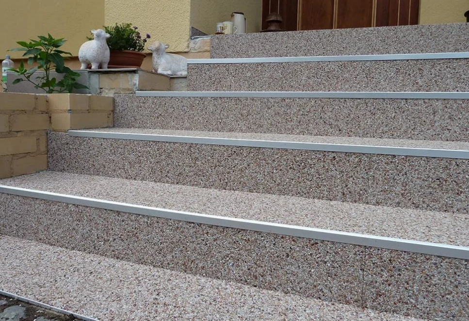 Une moquette de pierre est également un excellent choix pour les terrasses et escaliers, apportant une touche moderne et naturelle à vos aménagements extérieurs. Son mélange de granulats de pierre et de résine en fait un revêtement robuste, drainant et esthétique.